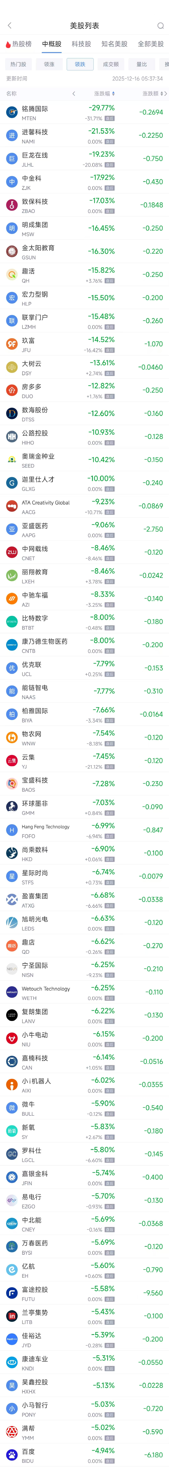 12月16日热门中概股多数下跌,纳斯达克中国金龙指数(HXC)收跌2.17%。
