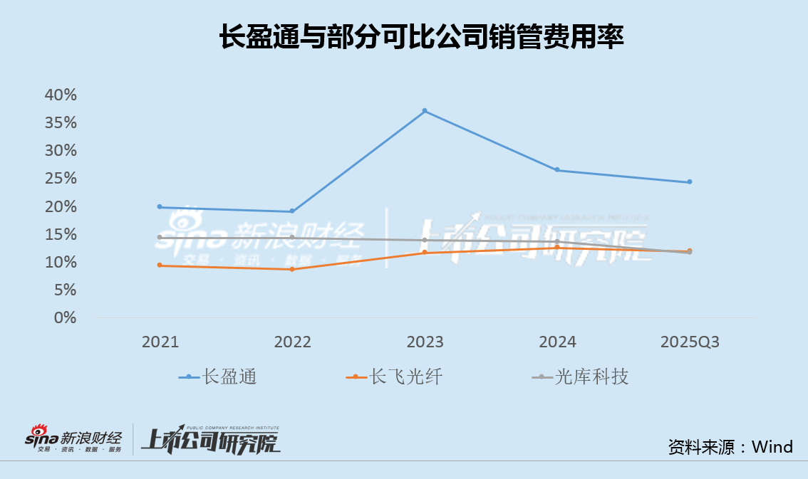 不过,长盈通资本开支长期高于经营现金流,资金入不敷出。同时,公司销管费用率畸高,特别是管理费用率高达20%,远超长飞光纤、光库科技等可比公司。