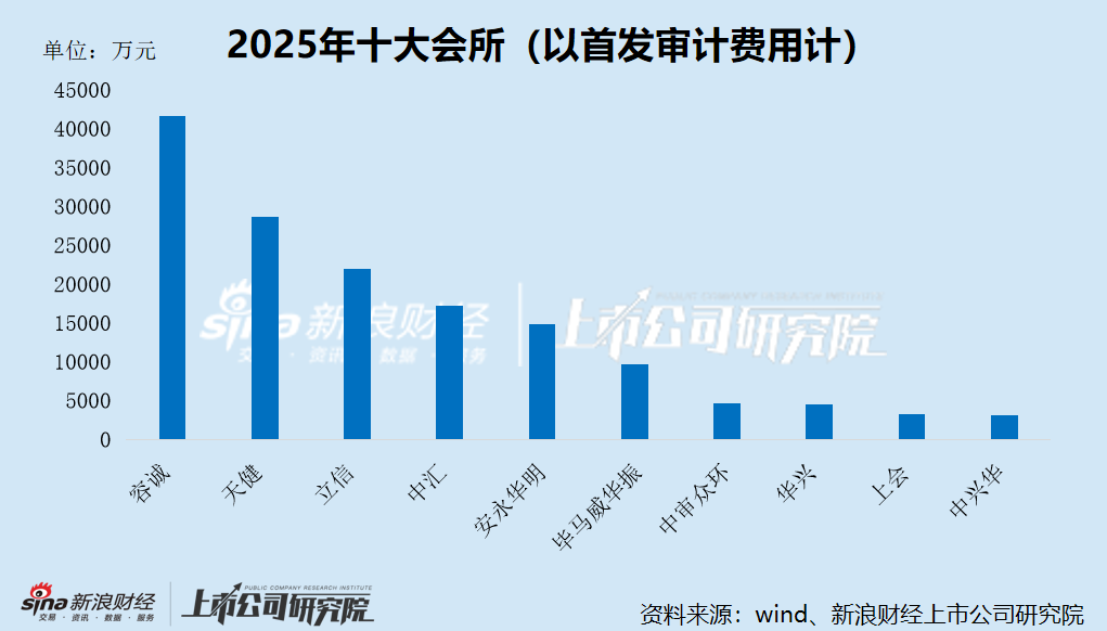 审计费排名前五的分别是容诚、天健、立信、中汇、安永华明,分别为4.17亿元、2.86亿元、2.19亿元、1.71亿元、1.49亿元。单个项目收费更高的是华电新能,审计机构为安永华明,IPO审计费为7577.12万元。